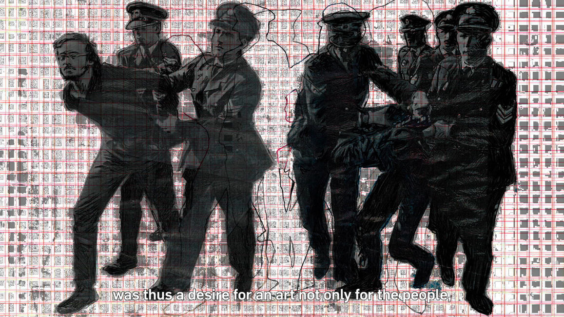 The video New Babylon (2024), created during a NIAS fellowship, explores the artist's social role by comparing the Situationist International, organization of social revolutionaries made up of artists and intellectuals (1957-1972) and Provo, a Dutch counterculture movement in the mid-1960s that focused on provoking violent responses from authorities using non-violent bait.